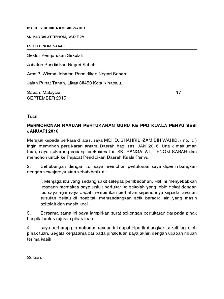 Contoh Surat Rayuan An Pertukaran Mengikut Suami Pdf